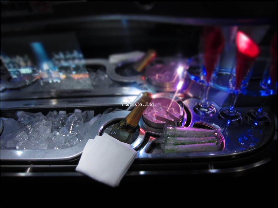 | 客席装備 | DVD/CD/Bluetooth 液晶モニター×2 シャンパングラス ロックグラス 氷 ミネラルウォーター500ml×3 紙おしぼり ティシュー |